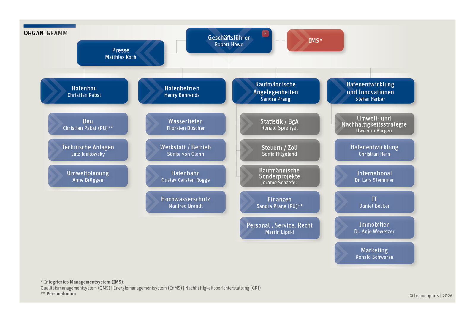 Wir leben die Hafenstadt – und 436 engagierte Mitarbeiter*innen begleiten uns dabei! Bereits seit Januar 2002 betreibt die bremenports GmbH & Co. KG im Auftrag der Freien Hansestadt Bremen, mit Ausnahme der Landseite im Fischereihafen, die Infrastruktur der Bremischen Häfen. Neben den beiden Verwaltungsgebäuden in der Sail City Bremerhaven sowie in der Überseestadt Bremen, unterhält bremenports zudem Werkstätten im Überseehafengebiet in Bremerhaven, in Bremen-Seehausen und in Bremen-Stadt. Darüber hinaus sind zahlreiche Beschäftigte an den vier großen Seeschleusen und an diversen Standorten der Bremischen Hafeneisenbahn tätig. Hinzu kommen temporär projektbezogene Baustellencontainer.